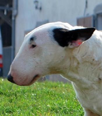 Nacionalidad: Gran Bretaña. Origen: Creado en 1830 cruzando el Bulldog con el viejo Terrier inglés y añadiéndole algo de sangre de Sabueso español. Fue empleado en las peleas con toros. Descripción: El animal adulto puede pesar entre 23-29 kgs. Debe dar la impresión de gran fortaleza y potencia, llamando la atención su particular cabeza en forma ovalada y larga, sin stop. Mandíbulas muy potentes, con dientes fuertes y regulares. Ojos oscuros, pequeños y en forma de almendra. Espalda robusta, cuerpo redondeado. Pelo corto, duro y brillante. Cola llevada horizontalmente, en acción llevada tensa. El manto es de color totalmente blanco, con manchas negras y atigrados en la cabeza y las orejas; leonado o atigrado con o sin manchas blancas en la cabeza, tórax y extremidades, bicolor negro, leonado o blanco. Carácter: A pesar de su temible y feroz aspecto, el Bullterrier nunca pasa inadvertido, es una de las razas más alegres y vivaces con la familia, profesando un desmesurado amor por los miembros de la familia, exteriorizado por sus infatigables ganas de juego y sus tiernos gestos. Poco sociable por lo general con otros perros, especialmente los machos.